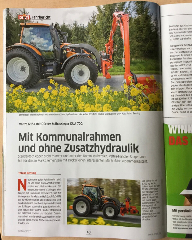 Ein mehrseiter Fahrbericht über die Zusammenarbeit der Firmen Valtra, Dücker und Stegemann ist in der Profi Ausgabe Juni 2017 erschienen.