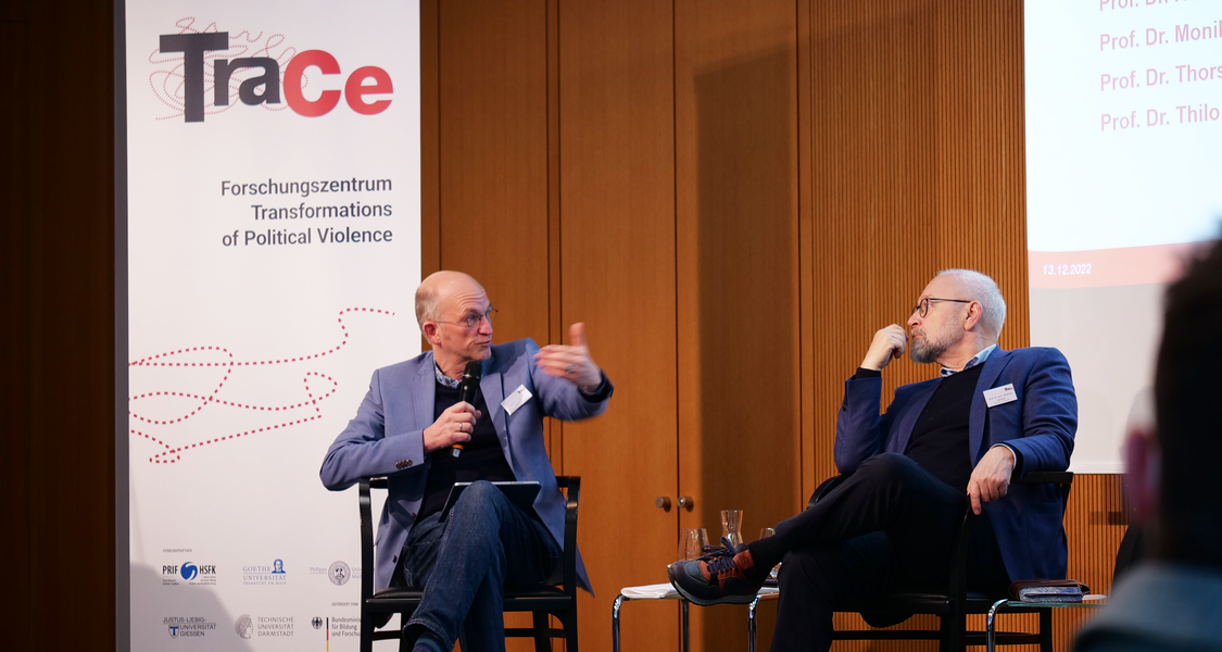 "Ein neuer alter Krieg?" Hessischer Forschungsverbund TraCe bot in Berlin Austausch zu russisch-ukrainischem Krieg. @Bonacker auf dem Podium mit Herfried, Monika Wingender und Thilo Marauhn, moderiert von Christopher Daase.