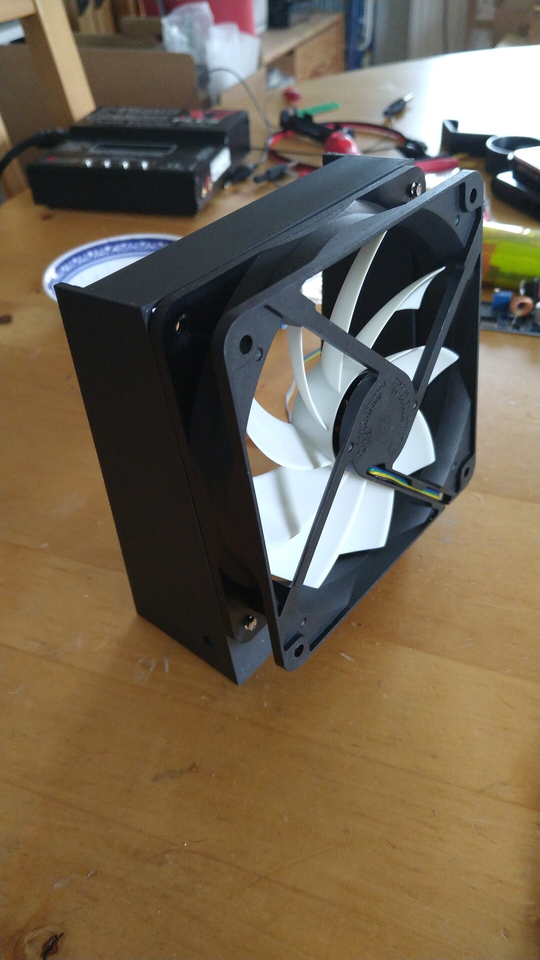 Wenn die Konstruktion ein bisschen kippelig ist (die untere Hälfte von einem Ventilatorturm) , dann kann man noch eine größere Standfläche für drunter drucken und ankleben, statt zu versuchen hinten Gewichte anzubringen (da habe ich nämlich nichts passendes).