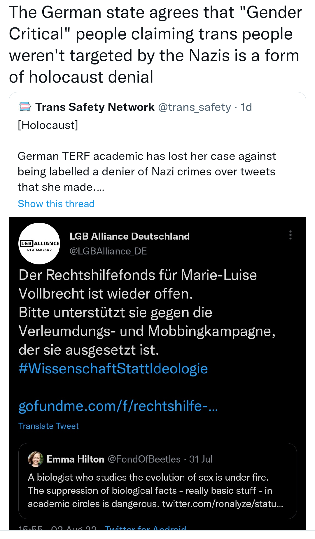"LGB Alliance literally call for the killing and elimination of transgender people. By allowing them in this section, Twitch is advocating for the genocide of transgender people."