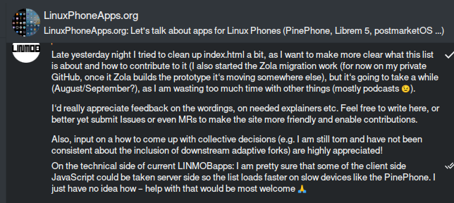 (BTW: Make sure to join our Matrix group: https://matrix.to/#/#linuxphoneapps:matrix.org)