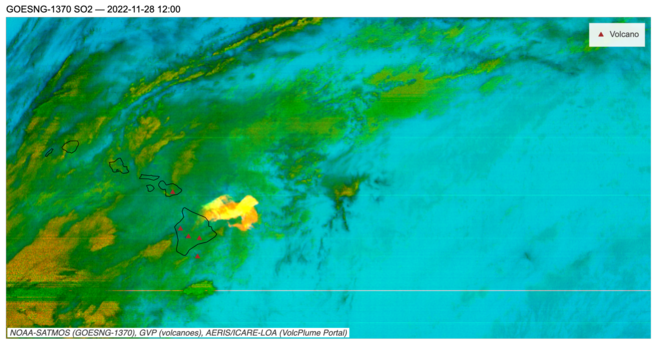 Sulfur dioxide (SO2) RGB composition of the 28 Nov 2022 Mauna Loa (Hawaii) eruption from GOESNG -137° geostationary imagery.