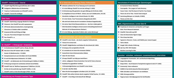 Mir wurde heute eine wirklich gute Sammlung zu #ChatGPT u. #KI in der Schule von Mirjam Egloff (PH Zürich) weitergeleitet, die ich gerne nochmal mit euch teile.