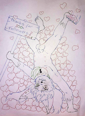 Wooooaaahh! i really didnt think i would even get people to follow me, and im already at 100??? Thank you from the depths of my lewd, lewd heart for all the support, here's a pic of Leppa falling over a pile of hearts! (exactly 100 hearts, i counted them as i was drawing them, im not counting the heart on the sign, or the hearts on Leppa's eyes)