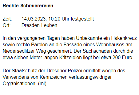 Die rechte Szene mobilisiert nun anlässlich der nächsten Sitzung des #Leuben|er Stadtbezirksbeirats für Mittwoch zu einer Kundgebung an die Hertzstraße/Reisstraße.