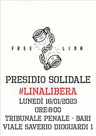 Per #LinaPinto presidio in solidarietà #Linalibera lunedì 16 Gennaio ore 8.00 presso il tribunale penale di Bari