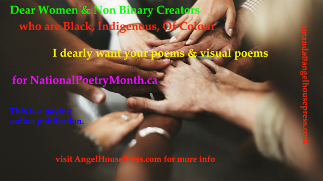 Dear BIPOC women and non-binary creators, i dearly want your poems for NationalPoetryMonth.ca. This is a paying online publication. The deadline is February 28. I look forward to reading your work. More information: AngelHousePress.com. You can contact me directly at amanda@angelhousepress.com