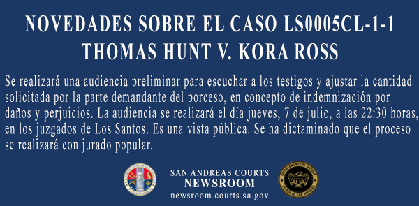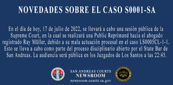 En el día de hoy se llevará a cabo una sesión pública a las 22:45 de la Corte Suprema del Estado de San Andreas en los Juzgados de Los Santos. 👩⚖️
