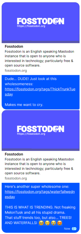 Me freaking out to a friend on Signal about #ThickTrunkTuesday and #WaterfallWednesday