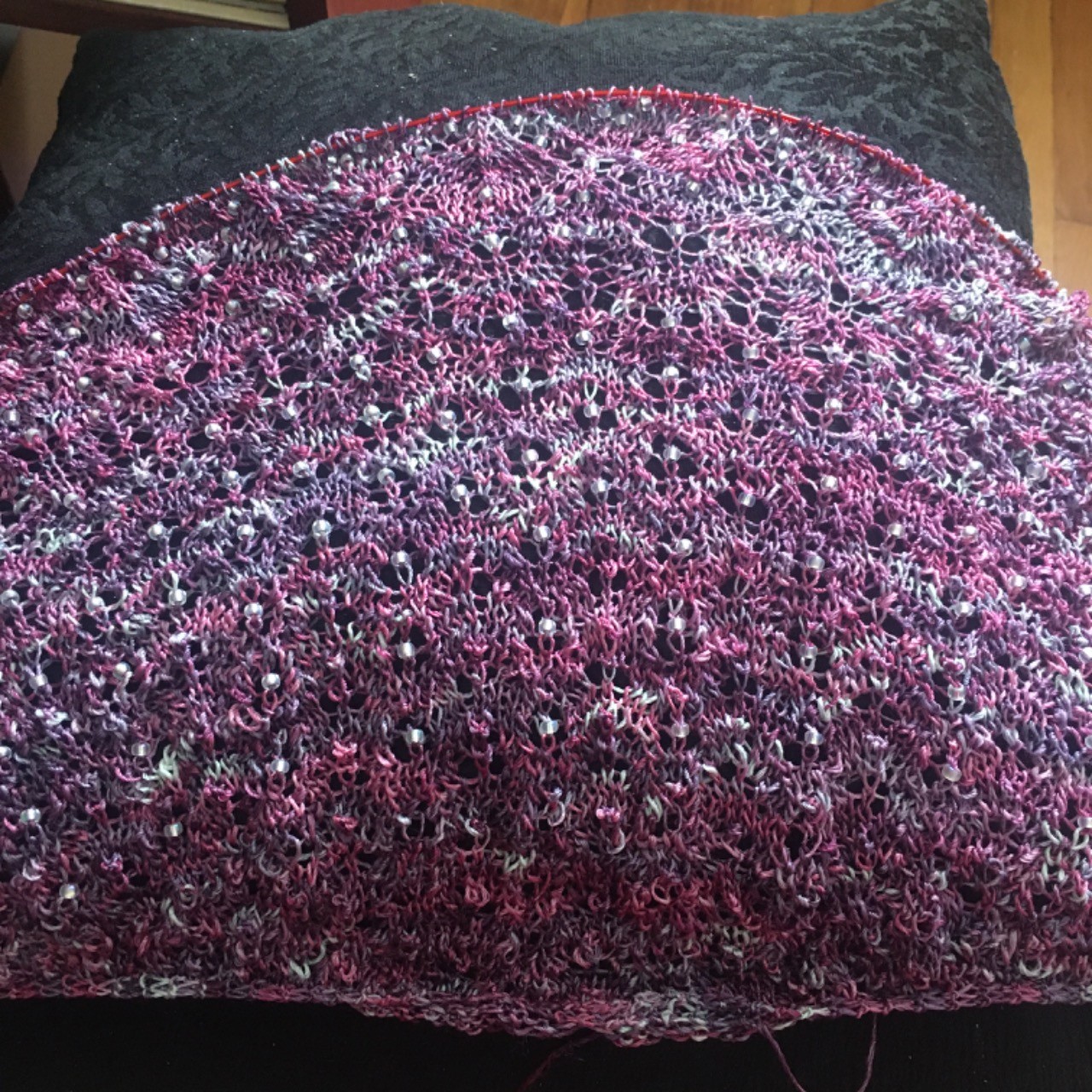 I like the opalescence of the beads, but I’m still waiting for the pattern to get exciting. Which it should rapidly, this is 70 odd rows deep.