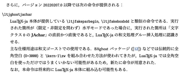 luatexja-adjust に \ltjghostjachar が追加された LuaTeX-ja 20220207.0 がリリースされてた.どこかのタイミングで(LuaTeX-ja 本体に組み込まれたら?)BXghost の \jghostguarded もこれを利用させてもらうことにさせてもらおう.