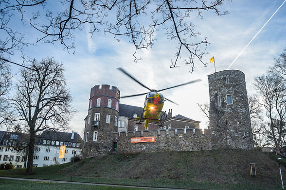 Man kann es oder man kann es nicht: Landen in beengter Umgebung (rechts stehen große Bäume) und auf unebenem Grund. Krankenhaus Bethanien, Solingen #Luftrettung