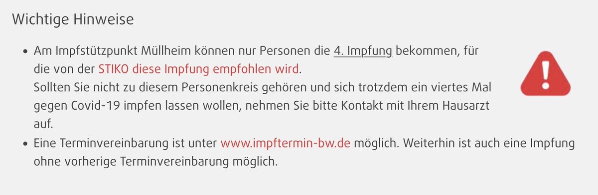 eingeschränkt Empfehlung Impfstützpunkt des @Landkreis_BH (wegen STIKO Begrenzung https://www.breisgau-hochschwarzwald.de/pb/Breisgau-Hochschwarzwald/Start/Service+_+Verwaltung/impfstuetzpunkt+muellheim.html)