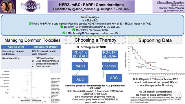 Thanks to @quirogad & @jane_meisel for taking us through the latest in #PARPi tx in HER2- #mBC.