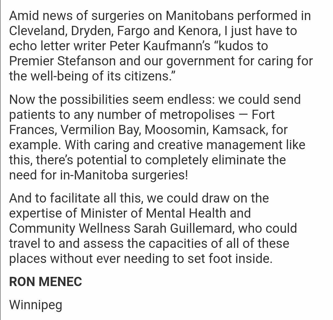 Tongue in cheek letter to the editor today. I don't think that Minister Sarah Guillemard is going to be able to shake this one. Look for a cabinet shuffle in the new year. #mbpoli