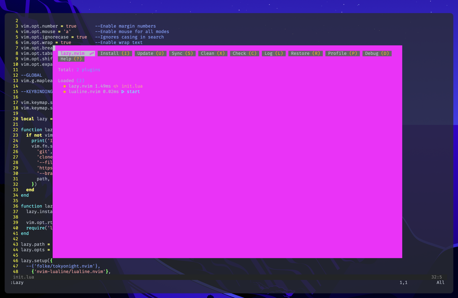 Very hyped that I was able to setup Lazy in #neovim on my #MacBookAirM2. After using a prebuilt NeoVim setup for 6 months I'm finally starting to put the pieces together myself to have what I need and I am so excited about it.