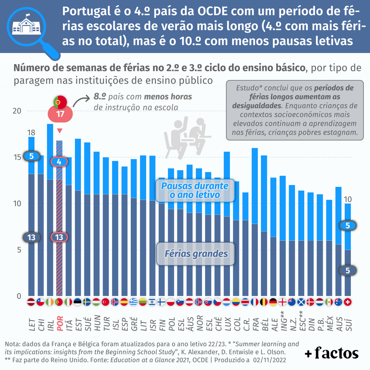 Férias escolares em Portugal concentram-se muito no verão, com poucas pausas durante o ano lectivo. Períodos longos de férias aumentam as desigualdades, segundo um estudo da Johns Hopkins University. Portugal é o 8º país da OCDE com menos horas de instrução na escola.