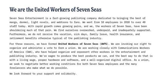 We, the workers of Seven Seas Entertainment (@gomanga@twitter.com), have formed a union. Attached is a screenshot of our mission statement.