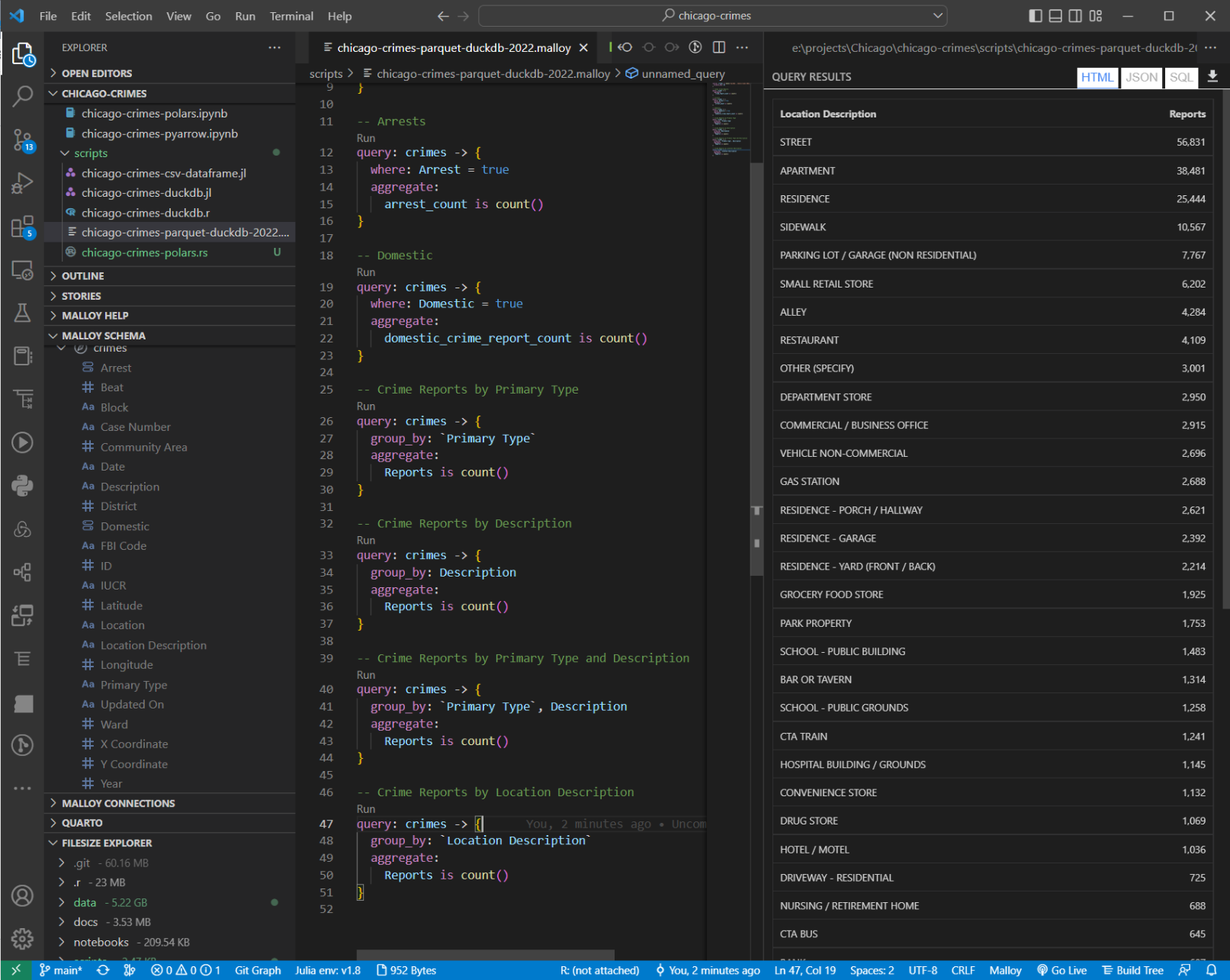 Here is a quick example of loading #ChicagoCrimes 2022 #parquetData with #DuckDB and Malloy queries for some rough counts and data summaries: