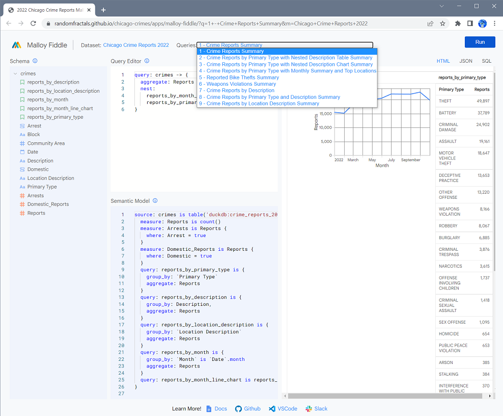 π’ New 2022 #ChicagoCrimes #MalloyData #Fiddle app you can run in a browser to learn Malloy model and query semantics, nesting, and simple charting ππ options: