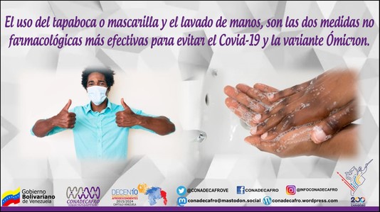 @conadecafro te recuerda: El uso del tapaboca o mascarilla y el lavado de manos son las dos medidas no farmacológicas más efectivas para evitar el Covid-19 y la variante Ómicron.