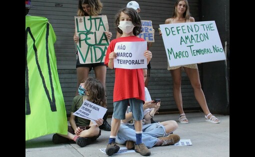 Today in front of Brazil's Consulate in New York: Child holds a sign in support of Indigenous Peoples, against Marco Temporal –the time limit trick that can evict people from their ancestral lands in Brazil –if legitimized by the Supreme Court.