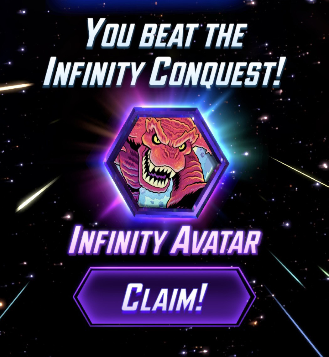 Iām not particularly great at #MarvelSnap but Iām pumped I beat infinity conquest! I really like this Devil Dino avatar and now it has a shiny border! #Gaming