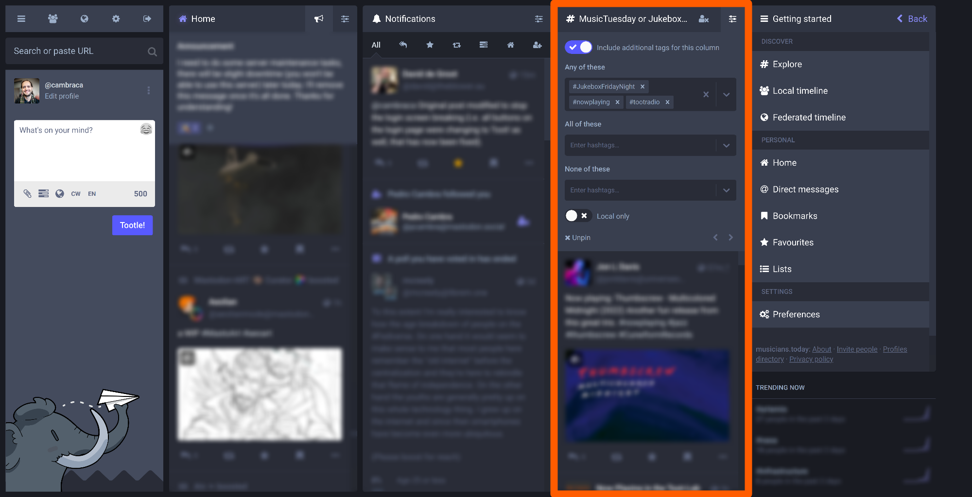 #MastodonTip If you're looking for something to listen to, try following the #NowPlaying hashtag. If you have the "advanced web interface" enabled, you can even "pin" the column permanently and add other hashtags.