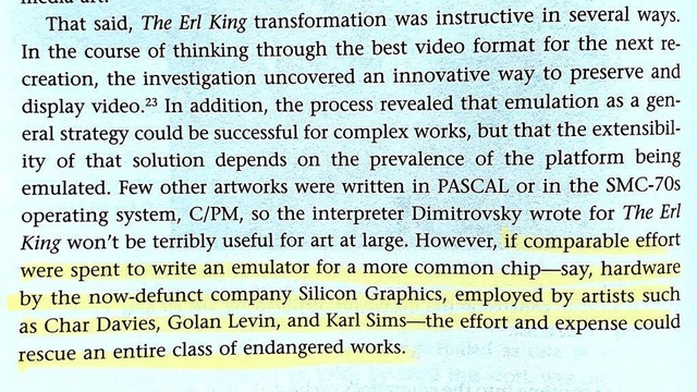 In 2014 my book Re-collection noted that emulating the defunct Silicon Graphics platform would resurrect groundbreaking works by artists like @golan, Char Davies, and Karl Sims. Reanimating SGI is a notoriously thorny challenge, but according to @ernie we could be $6,500 away from approaching this dream.