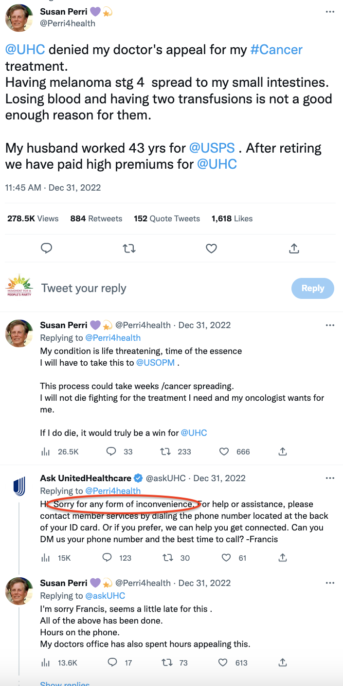 The woman's dying of cancer, insurance denied treatment, but they apologize for any "inconvenience".🤬