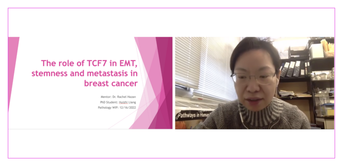 It's a wrap! For the final #Pathology works in progress of 2022, @EinsteinMed #PhD candidate Huizhi Liang, MS, in the lab of Rachel Hazan, PhD, presented her updated research on the role of TCF7 in EMT, stemness, and #metastatic breast cancer. Thanks for an impressive talk!