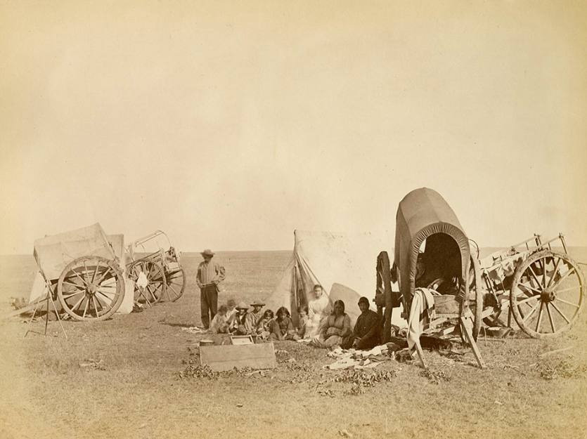 A group of Metis set up camp with their carts and tents on the Canadian Prairies. Location is not known.