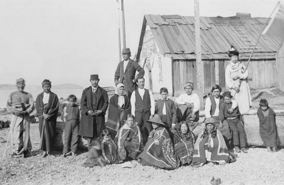 A group of Metis and Kwakwaka'wakw First Nation people at Fort Rupert, British Columbia in 1885.