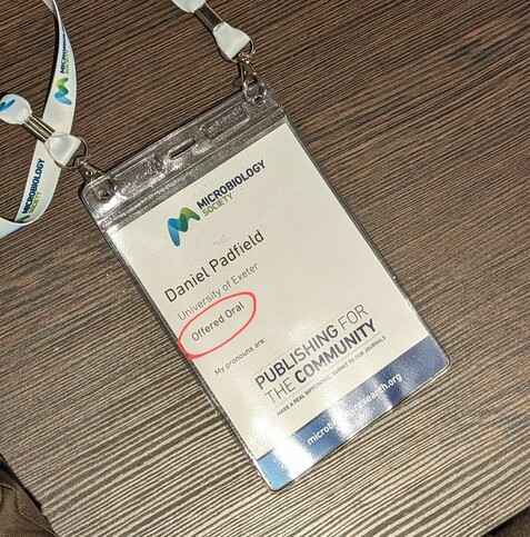 Somewhat unfortunate wording on my name badge for #MicroEvo22