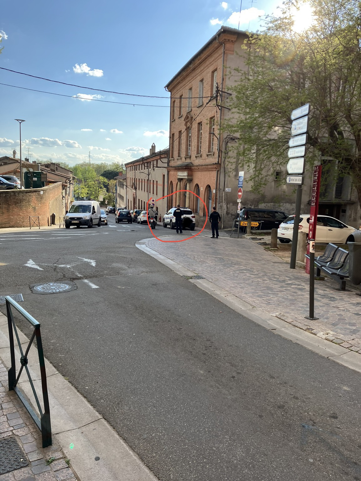 La police municipale de #Montauban garée sur un premier passage piéton et deux roues qui rognent sur le mini trottoir et gênent les passants qui remontent sur le deuxième passage piéton. #superbe #GCUM