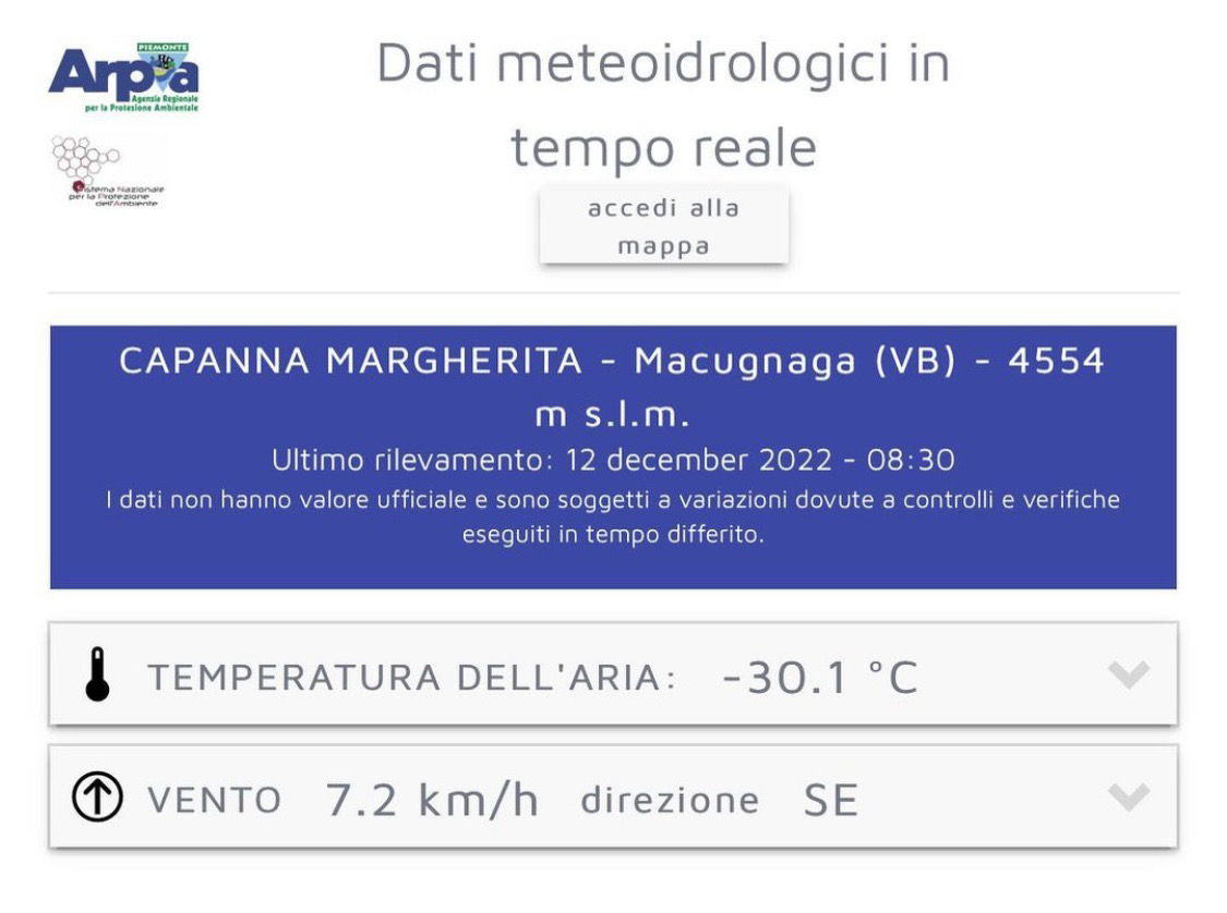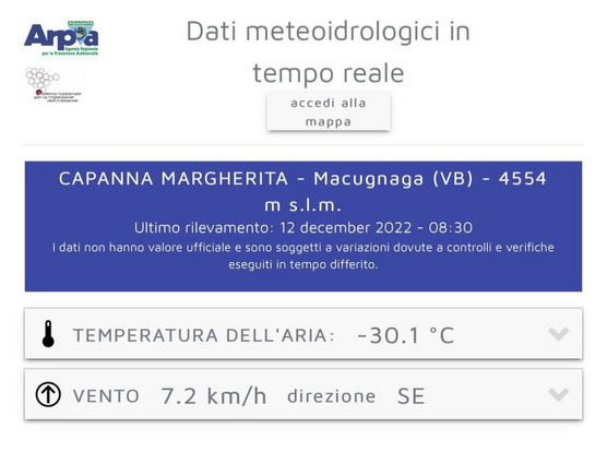 Temperatura di questa mattina (12 dicembre 2022) ore 08:30 al rifugio capanna Margherita, punta Gnifetti a 4.554 m. s.l.m.