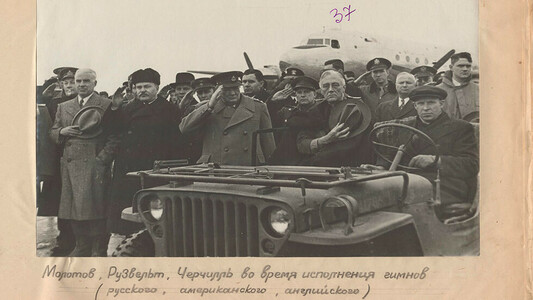 (left to right) Soviet FM Molotov, British PM Churchill and US President Roosevelt at the Sevastopol airport, Crimea, #USSR, Feb. 1945…