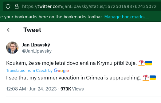 "'I see that my summer holidays in Crimea are approaching,' Czech Foreign Minister Jan Lipavsky wrote on Twitter yesterday.
