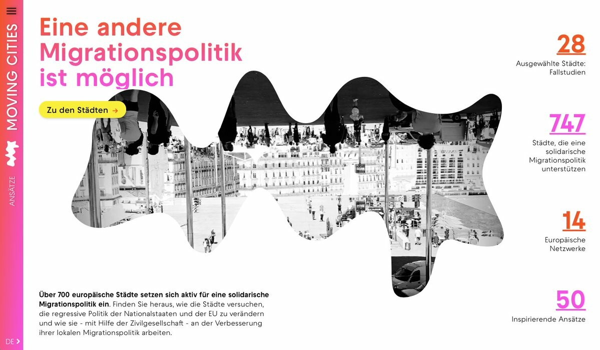 Progressive Stadtpolitik europaweit: #MovingCities ist das erste Mapping, das eine eingehende Recherche zu 28 solidarischen Städten und ihren Ansätzen zur Aufnahme von Migrant:innen und Geflüchteten bereitstellt.