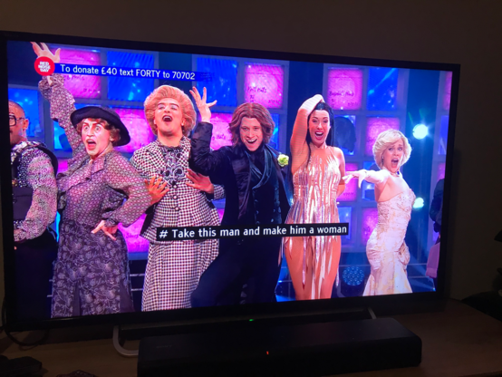 Picture: clip from #BBC #ComicRelief of musical cast singing ‘Make me a Women’. Men in drag as famous women led by Oscar Wilde.