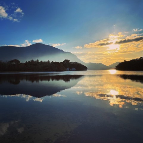 #Sunset at #Muckross Lake #Killarney with a near perfect reflection. The haze across the bottom of Torc mountain is from a nearby gorse fire. #Photography #Ireland