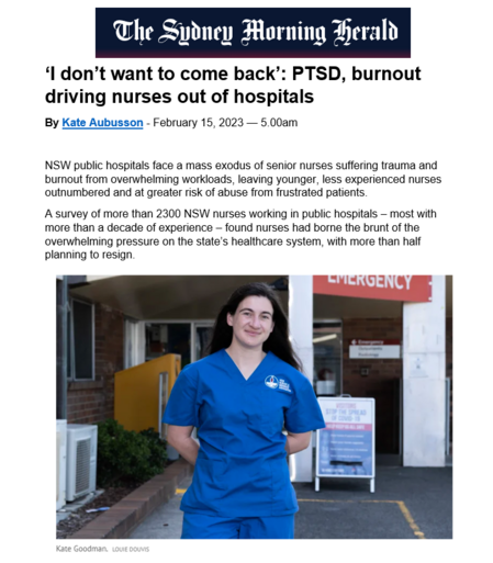 NSW public hospitals face a mass exodus of senior nurses suffering trauma and burnout from overwhelming workloads, leaving younger, less experienced nurses outnumbered and at greater risk of abuse from frustrated patients.