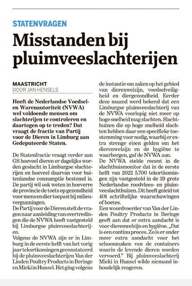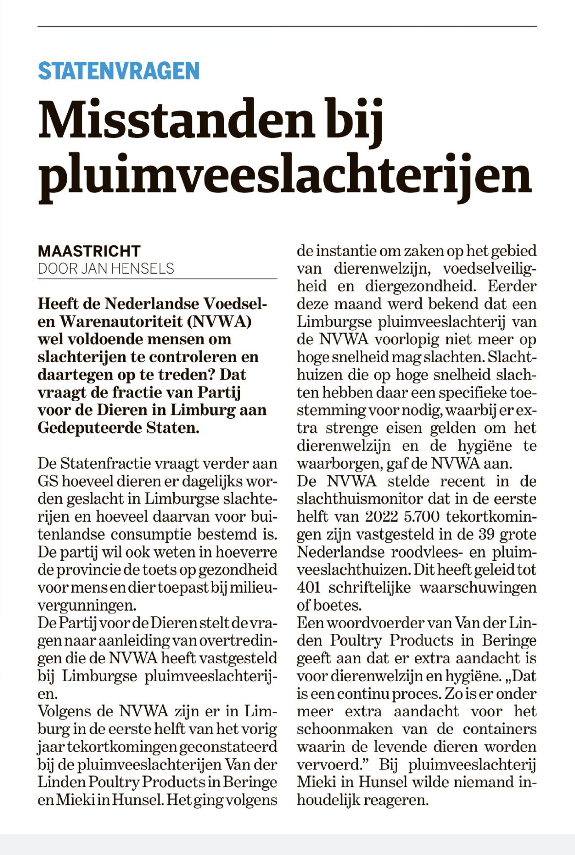 De eerste berichten over misstanden bij (kippen)slachterijen zijn pas van 2006. De #NVWA heeft weinig haast. En aan Jan Hensels zou ik willen vragen 401 schriftelijke waarschuwingen en hoeveel boetes? En hoe hoog zijn die boetes?
