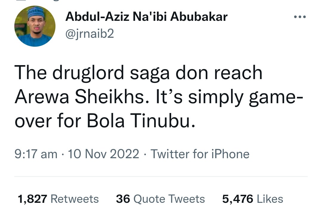 The druglord saga don reach Arewa Sheikhs. Itβs simply game-over for Bola Tinubu.