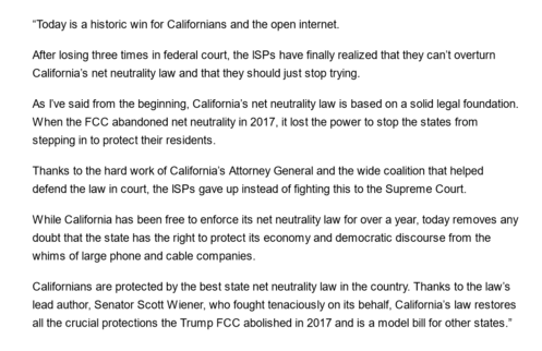 My statement, background & details: https://cyberlaw.stanford.edu/blog/2022/05/isps-drop-legal-fight-against-california-net-neutrality-law