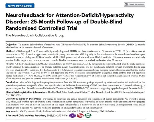 #JAACAP authors report on the 25-month follow-up of a double-blind randomized controlled trial of #neurofeedback for #ADHD. https://www.jaacap.org/article/S0890-8567(22)01971-2/fulltext