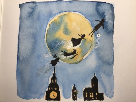 This was the prompt for day seven of #inktober, 2020. This image of Peter Pan, Tinkerbell and the Darling children on their way to Neverland was the first thing that came to my mind and I love how it turned out.