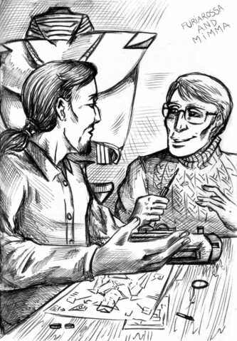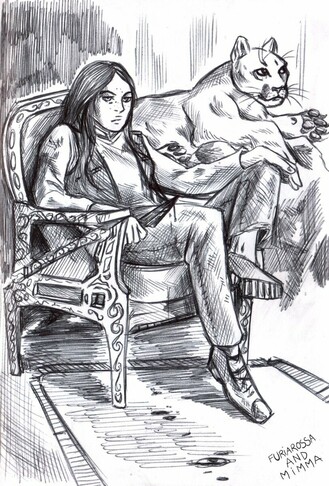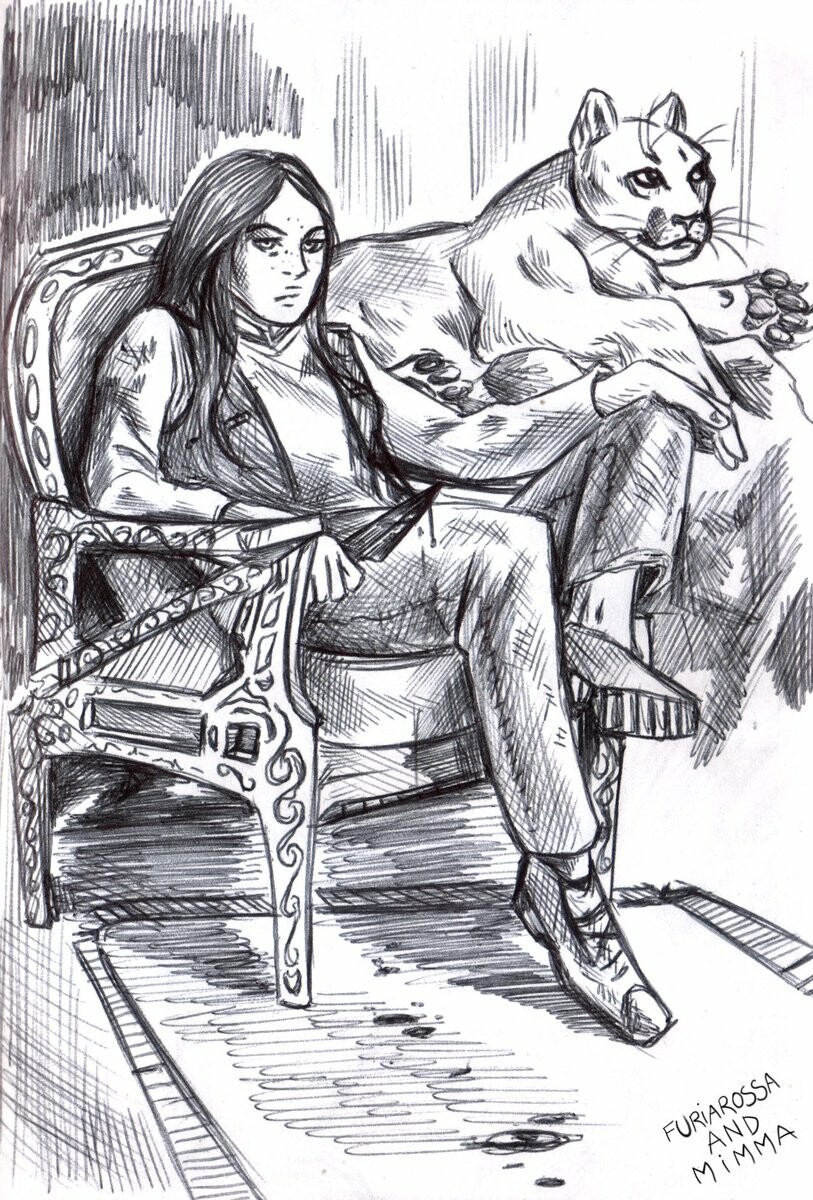 Cherry Gale with her best friend: a puma named Prince. Ballpoint pen sketch.