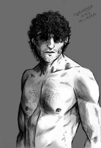 Hawk's hair is usually perfectly styled, forehead free, curls pushed up. This is the first time we've drawn him post-shower: hair low over his eyes, bare torso. Not bad, huh?