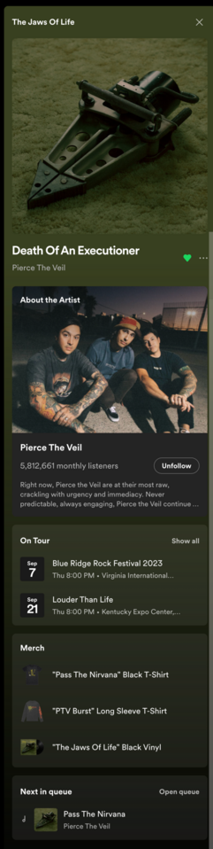 As promised during Q2's Investor Call, Spotify is now showcasing merch prominently in the Now Playing View, which is for sale in the Spotify Shop, e.g.: https://shop.spotify.com/en/artist/4iJLPqClelZOBCBifm8Fzv/product/pierce-the-veil-the-jaws-of-life-black-vinyl